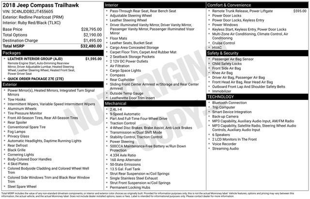 Discover the perfect balance of capability and comfort in the 2018 Jeep Compass Trailhawk. This striking red SUV boasts a powerful 2.4L I4 engine paired with a 9-Speed Automatic transmission and 4WD, delivering an impressive 22 MPG in the city and 30 MPG on the highway.