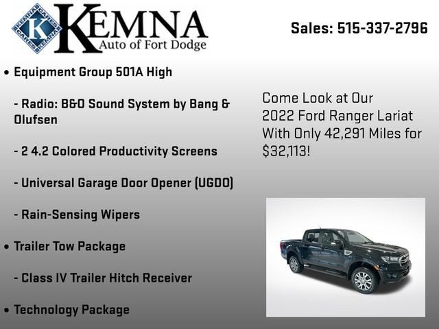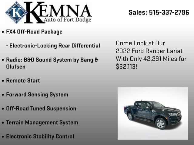 Whether you're looking for a capable work truck, a versatile adventure vehicle, or a well-equipped daily driver, this 2022 Ford Ranger Lariat has it all. With its impressive performance, advanced technology, and premium features, this Ranger is sure to exceed your expectations. Visit our showroom today to experience it for yourself and see why it's the perfect choice for your next vehicle.