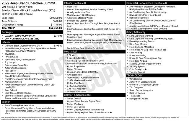 Introducing the 2022 Jeep Grand Cherokee Summit, a remarkable SUV that combines unparalleled capability, luxurious comfort, and cutting-edge technology. With its stunning Diamond Black Crystal Pearlcoat exterior and meticulously crafted Black interior, this vehicle is a true head-turner.