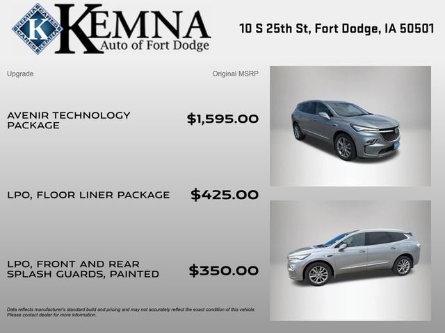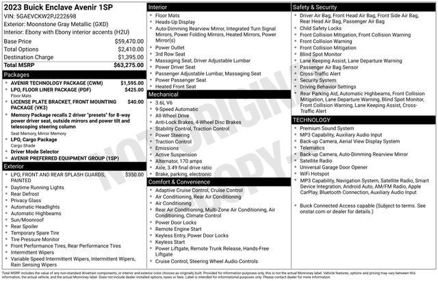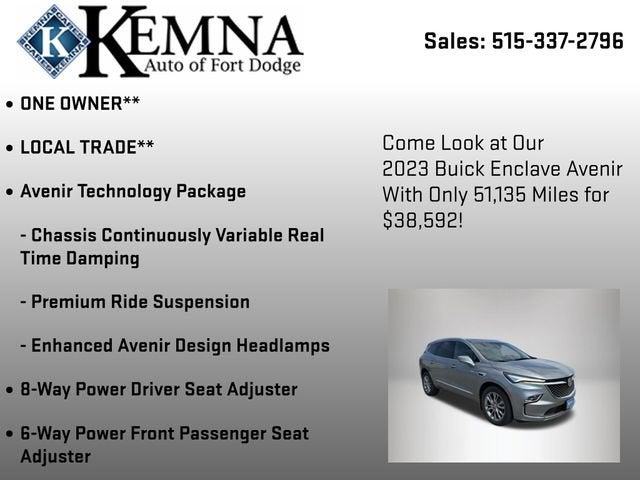 Discover the ultimate luxury SUV experience with the 2023 Buick Enclave Avenir. This exceptional vehicle combines sophisticated style, advanced technology, and exceptional performance to elevate your driving pleasure.- One Owner- Local Trade- Avenir Technology Package- Floor Liner Package- Front Mounting License Plate Bracket Package- Heads-Up Display- Power Liftgate- Chassis Continuously Variable Real Time Damping- Premium Ride Suspension- Auto High-beam Headlights- Enhanced Avenir Design Headlamps- Heated and Ventilated Front Seats- Power MoonroofBoasting a commanding presence with its bold, sculpted exterior, the Enclave Avenir commands attention wherever it goes. The sleek, aerodynamic design not only turns heads but also enhances efficiency, delivering an impressive 25 mpg on the highway.Under the hood, the 3.6L V6 engine with 9-speed automatic transmission and available all-wheel drive provides the perfect balance of power and control. Whether navigating city streets or tackling winding roads, the Enclave Avenir delivers a smooth, responsive, and confident driving experience.Step inside the luxurious cabin, and you'll be surrounded by premium materials and thoughtful amenities. The Avenir-exclusive design elements, including the enhanced headlamps and unique grille, elevate the Enclave's sophisticated style. Sink into the heated and ventilated front seats, and enjoy the convenience of the power liftgate and Heads-Up Display.The Enclave Avenir's advanced technology features keep you connected and in control. Wireless Apple CarPlay and Android Auto integration seamlessly integrate your smartphone, while the Bose premium audio system provides an immersive listening experience. With the available Avenir Technology Package, you'll also enjoy the added benefits of the chassis' continuously variable real-time damping and premium ride suspension, ensuring a smooth and responsive ride.Safety is paramount in the Enclave Avenir, with a host of advanced driver-assistance features, including Front and Rear Park Assist, Rear Camera, and more, providing you with peace of mind on every journey.Experience the ultimate in luxury, performance, and technology with the 2023 Buick Enclave Avenir. Visit our showroom today and let us demonstrate how this exceptional SUV can elevate your driving experience.