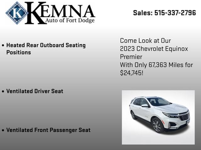 Discover the ultimate driving experience with this exceptional 2023 Chevrolet Equinox Premier. Boasting a sleek and sophisticated design, this SUV is engineered to deliver unparalleled performance, comfort, and convenience.- LOCAL TRADE**- CONFIDENCE & CONVENIENCE II PACKAGE- INFOTAINMENT II PACKAGE- Adaptive Cruise Control- Automatic Front & Rear Parking Assist- HD Surround Vision- Heated steering wheel- Heated and Ventilated SeatsUnder the hood, the Equinox Premier is powered by a 1.5L DOHC engine, paired with a 6-Speed Automatic Electronic Transmission with Overdrive and All-Wheel Drive. This combination delivers an impressive blend of power and efficiency, with an EPA-estimated 24 MPG in the city and 30 MPG on the highway.The exterior of this Equinox Premier exudes a refined and modern aesthetic, with a stunning White Iridescent Pearl Tricoat finish that turns heads wherever you go. The sleek lines and bold design elements create a commanding presence on the road, while the power sunroof and roof rails add a touch of versatility and style.Step inside the Equinox Premier, and you'll be greeted by a premium cabin that's been thoughtfully crafted to provide the ultimate in comfort and convenience. The perforated leather-appointed seats, heated and ventilated for year-round comfort, offer exceptional support and luxury. The Bose premium audio system and Chevrolet Infotainment 3 Plus system with connected navigation ensure you'll enjoy every mile with crystal-clear sound and seamless connectivity.Safety is a top priority in the Equinox Premier, with a suite of advanced driver-assistance features that include Adaptive Cruise Control, Automatic Front and Rear Parking Assist, and HD Surround Vision. These cutting-edge technologies work together to help keep you and your passengers safe on the road.Whether you're commuting to the office, embarking on a family road trip, or tackling your next adventure, this 2023 Chevrolet Equinox Premier is the perfect companion. Experience the ultimate in performance, comfort, and technology by scheduling a test drive today. We're confident this exceptional SUV will exceed your expectations and become the perfect addition to your lifestyle.