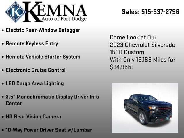 Discover the perfect blend of power, capability, and modern convenience with this 2023 Chevrolet Silverado 1500 Custom. This rugged and versatile pickup is ready to take on any task, whether it's hauling heavy loads, tackling off-road adventures, or providing a comfortable and connected driving experience.