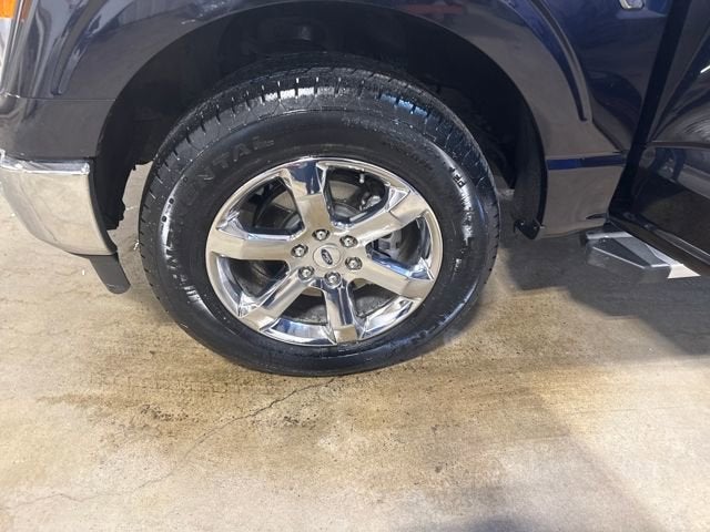 Beyond its impressive capabilities, this F-150 Lariat offers exceptional fuel efficiency, with an EPA-estimated 18 city and 23 highway MPG. The striking blue exterior and 20-inch chrome-like PVD wheels give this truck a bold, commanding presence on the road.