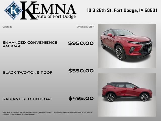 Experience the exceptional 2024 Chevrolet Blazer RS, a versatile and well-appointed SUV that seamlessly blends style, performance, and convenience. This one-owner, locally traded Blazer RS is the perfect companion for your adventures, offering a striking Radiant Red Tintcoat exterior and a bold two-tone black roof that commands attention.- ONE OWNER**- LOCAL TRADE**- ENHANCED CONVENIENCE PACKAGE: Includes memory settings, heated rear outboard seats, ventilated front seats, and power tilt and telescoping steering column- BLACK TWO-TONE ROOF- Power Liftgate- Apple CarPlay/Android Auto- Heated Steering Wheel- Memory Settings For Driver Seat & Exterior Mirrors- Heated Driver & Front Passenger Seats- Heated Rear Outboard Seating Positions- Ventilated Driver & Front Passenger SeatsUnder the hood, this Blazer RS is powered by a 3.6L V6 SIDI engine, paired with a 9-speed automatic transmission and all-wheel drive, delivering an impressive balance of power and efficiency with 18 city/26 highway MPG.Step inside the Blazer RS and you'll be greeted by a premium Bose audio system, dual-zone automatic climate control, and a Chevrolet Infotainment 3 Premium system with navigation and SiriusXM. The leather-appointed seats offer exceptional comfort, with the driver's seat featuring 8-way power adjustability and lumbar support.Safety and technology are also at the forefront, with features like forward collision alert, lane keep assist, and automatic high beams. The Blazer RS also boasts a suite of advanced driver assistance technologies to help keep you and your passengers secure on the road.This well-equipped Blazer RS is the perfect blend of style, capability, and convenience. With its impressive list of features and one-owner, local trade status, this SUV is a must-see for any discerning buyer. Schedule a test drive today and experience the exceptional Chevrolet Blazer RS for yourself.