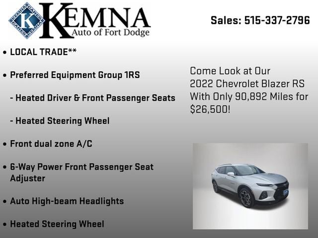 Experience the power and sophistication of the 2022 Chevrolet Blazer RS. This exceptional SUV combines bold styling, advanced technology, and exceptional performance to deliver an unparalleled driving experience.- LOCAL TRADE**- LICENSE PLATE FRONT MOUNTING PACKAGE- Preferred Equipment Group 1RS- Front dual zone A/C- 6-Way Power Front Passenger Seat Adjuster- Auto High-beam Headlights- Heated Steering Wheel- Heated Driver & Front Passenger SeatsBeneath the striking exterior, the Blazer RS boasts a 3.6L V6 SIDI engine paired with a responsive 9-speed automatic transmission and all-wheel drive. This powertrain delivers an exhilarating 19 city/26 highway MPG, ensuring you can conquer the open road with confidence.The Blazer's impressive list of features continues inside, where you'll find a wealth of advanced technology and premium amenities. The Chevrolet Infotainment 3 Plus System with a large touchscreen display puts a world of connectivity and entertainment at your fingertips, while the available navigation system ensures you'll never lose your way. Dual-zone climate control, a heated steering wheel, and heated front seats provide exceptional comfort, no matter the weather.Safety is also a top priority in the Blazer RS, with a comprehensive suite of driver-assist technologies, including Rear Park Assist, Automatic Emergency Braking, and Lane Keep Assist. You can drive with confidence, knowing you and your passengers are well-protected.Whether you're tackling your daily commute or embarking on a weekend adventure, the 2022 Chevrolet Blazer RS is the perfect companion. Its bold style, impressive performance, and thoughtful features make it a standout in the SUV segment. Experience the difference for yourself and schedule a test drive today.